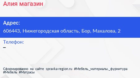 Алия, магазин по адресу 606443, Нижегородская область, Бор, Махалова, 2 в дальнейшем Организация, размещена в следующих категориях: