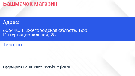 Башмачок, магазин по адресу 606440, Нижегородская область, Бор, Интернациональная, 28 в дальнейшем Организация, размещена в следующих категориях: