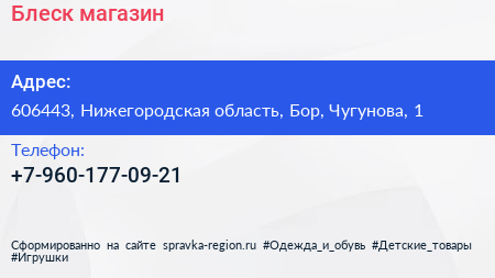 Блеск, магазин по адресу 606443, Нижегородская область, Бор, Чугунова, 1 в дальнейшем Организация, размещена в следующих категориях: