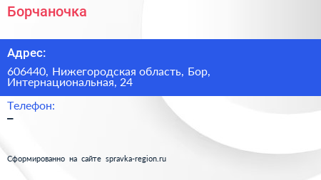 Борчаночка по адресу 606440, Нижегородская область, Бор, Интернациональная, 24 в дальнейшем Организация, размещена в следующих категориях: