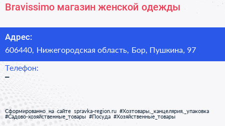Bravissimo, магазин женской одежды по адресу 606440, Нижегородская область, Бор, Пушкина, 97 в дальнейшем Организация, размещена в следующих категориях: