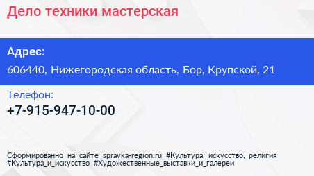 Дело техники, мастерская по адресу 606440, Нижегородская область, Бор, Крупской, 21 в дальнейшем Организация, размещена в следующих категориях: