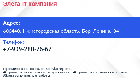 Элегант, компания по адресу 606440, Нижегородская область, Бор, Ленина, 84 в дальнейшем Организация, размещена в следующих категориях: