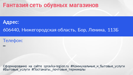 Fантазия, сеть обувных магазинов по адресу 606440, Нижегородская область, Бор, Ленина, 113Б в дальнейшем Организация, размещена в следующих категориях: