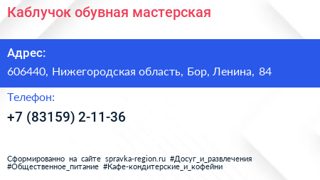Каблучок, обувная мастерская по адресу 606440, Нижегородская область, Бор, Ленина, 84 в дальнейшем Организация, размещена в следующих категориях: