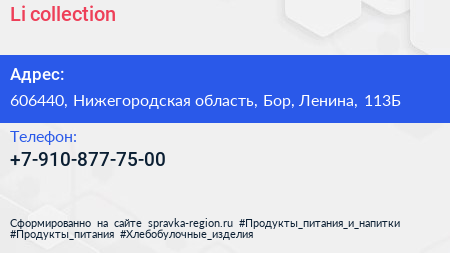 Li collection по адресу 606440, Нижегородская область, Бор, Ленина, 113Б в дальнейшем Организация, размещена в следующих категориях:
