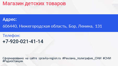 Магазин детских товаров по адресу 606440, Нижегородская область, Бор, Ленина, 131 в дальнейшем Организация, размещена в следующих категориях: