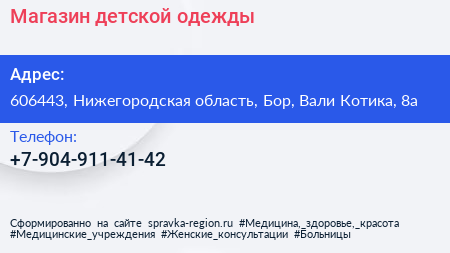 Магазин детской одежды по адресу 606443, Нижегородская область, Бор, Вали Котика, 8а в дальнейшем Организация, размещена в следующих категориях: