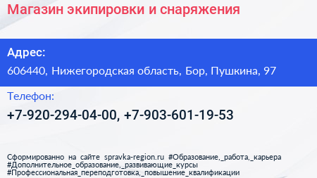 Магазин экипировки и снаряжения по адресу 606440, Нижегородская область, Бор, Пушкина, 97 в дальнейшем Организация, размещена в следующих категориях: