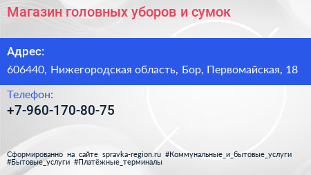Магазин головных уборов и сумок по адресу 606440, Нижегородская область, Бор, Первомайская, 18 в дальнейшем Организация, размещена в следующих категориях: