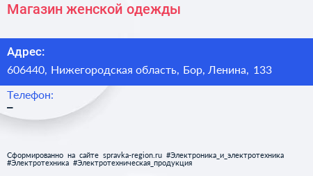 Магазин женской одежды по адресу 606440, Нижегородская область, Бор, Ленина, 133 в дальнейшем Организация, размещена в следующих категориях: