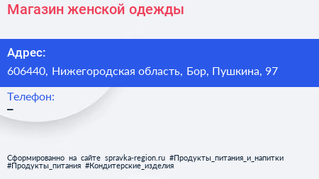 Магазин женской одежды по адресу 606440, Нижегородская область, Бор, Пушкина, 97 в дальнейшем Организация, размещена в следующих категориях: