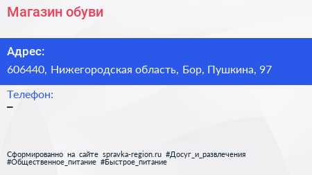 Магазин обуви по адресу 606440, Нижегородская область, Бор, Пушкина, 97 в дальнейшем Организация, размещена в следующих категориях: