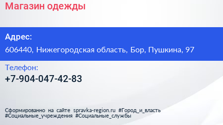 Магазин одежды по адресу 606440, Нижегородская область, Бор, Пушкина, 97 в дальнейшем Организация, размещена в следующих категориях: