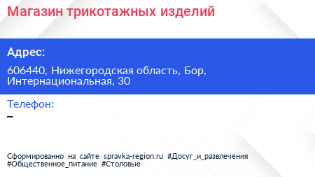 Магазин трикотажных изделий по адресу 606440, Нижегородская область, Бор, Интернациональная, 30 в дальнейшем Организация, размещена в следующих категориях: