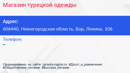 Магазин турецкой одежды по адресу 606440, Нижегородская область, Бор, Ленина, 106 в дальнейшем Организация, размещена в следующих категориях: