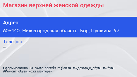 Магазин верхней женской одежды по адресу 606440, Нижегородская область, Бор, Пушкина, 97 в дальнейшем Организация, размещена в следующих категориях: