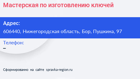 Мастерская по изготовлению ключей по адресу 606440, Нижегородская область, Бор, Пушкина, 97 в дальнейшем Организация, размещена в следующих категориях: