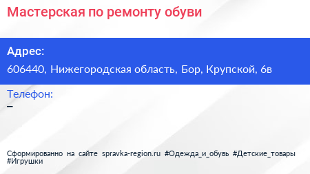 Мастерская по ремонту обуви по адресу 606440, Нижегородская область, Бор, Крупской, 6в в дальнейшем Организация, размещена в следующих категориях: