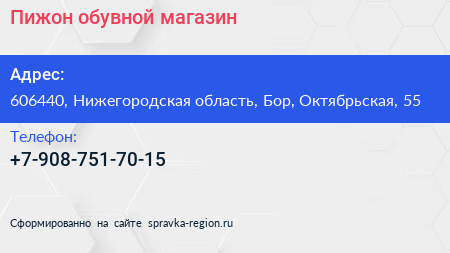 Пижон, обувной магазин по адресу 606440, Нижегородская область, Бор, Октябрьская, 55 в дальнейшем Организация, размещена в следующих категориях: