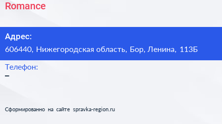 Romance по адресу 606440, Нижегородская область, Бор, Ленина, 113Б в дальнейшем Организация, размещена в следующих категориях: