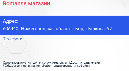 Romanse, магазин по адресу 606440, Нижегородская область, Бор, Пушкина, 97 в дальнейшем Организация, размещена в следующих категориях: