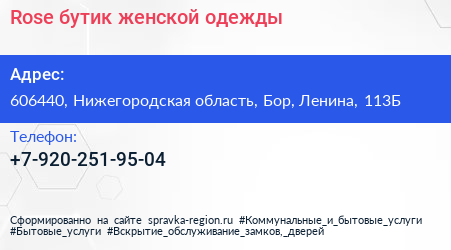 Rose, бутик женской одежды по адресу 606440, Нижегородская область, Бор, Ленина, 113Б в дальнейшем Организация, размещена в следующих категориях: