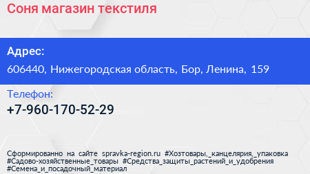 Соня, магазин текстиля по адресу 606440, Нижегородская область, Бор, Ленина, 159 в дальнейшем Организация, размещена в следующих категориях:
