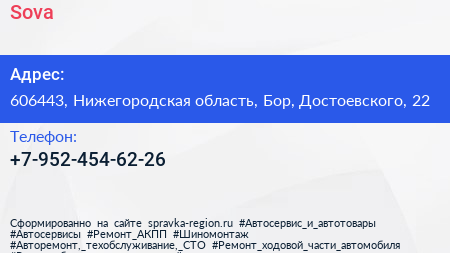 Sova по адресу 606443, Нижегородская область, Бор, Достоевского, 22 в дальнейшем Организация, размещена в следующих категориях: