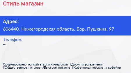Стиль, магазин по адресу 606440, Нижегородская область, Бор, Пушкина, 97 в дальнейшем Организация, размещена в следующих категориях: