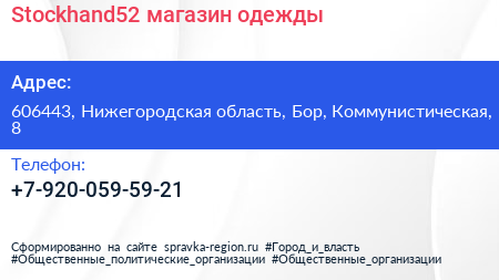 Stockhand52, магазин одежды по адресу 606443, Нижегородская область, Бор, Коммунистическая, 8 в дальнейшем Организация, размещена в следующих категориях:
