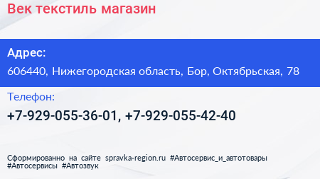 Век-текстиль, магазин по адресу 606440, Нижегородская область, Бор, Октябрьская, 78 в дальнейшем Организация, размещена в следующих категориях: