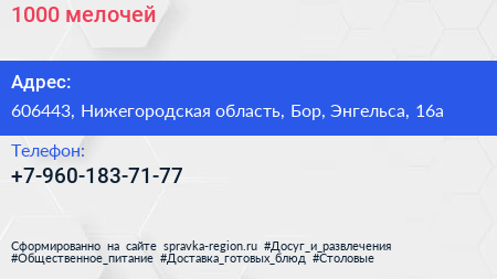 1000 мелочей по адресу 606443, Нижегородская область, Бор, Энгельса, 16а в дальнейшем Организация, размещена в следующих категориях: