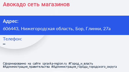 Авокадо, сеть магазинов по адресу 606443, Нижегородская область, Бор, Глинки, 27а в дальнейшем Организация, размещена в следующих категориях: