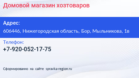 Домовой, магазин хозтоваров по адресу 606446, Нижегородская область, Бор, Мыльникова, 1в в дальнейшем Организация, размещена в следующих категориях: