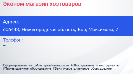 Эконом, магазин хозтоваров по адресу 606443, Нижегородская область, Бор, Максимова, 7 в дальнейшем Организация, размещена в следующих категориях: