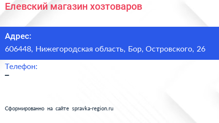 Елевский, магазин хозтоваров по адресу 606448, Нижегородская область, Бор, Островского, 26 в дальнейшем Организация, размещена в следующих категориях: