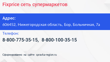 Fixprice, сеть супермаркетов по адресу 606452, Нижегородская область, Бор, Больничная, 7а в дальнейшем Организация, размещена в следующих категориях:
