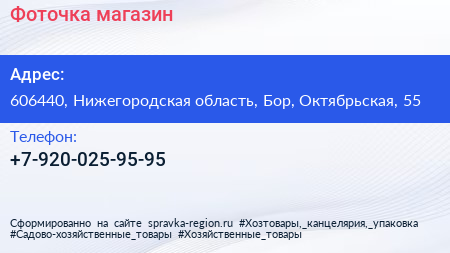 Фоточка, магазин по адресу 606440, Нижегородская область, Бор, Октябрьская, 55 в дальнейшем Организация, размещена в следующих категориях: