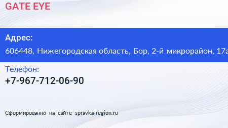 GATE EYE по адресу 606448, Нижегородская область, Бор, 2-й микрорайон, 17а в дальнейшем Организация, размещена в следующих категориях:
