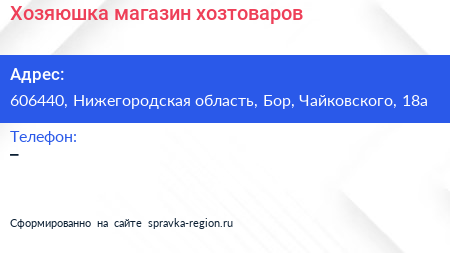 Хозяюшка, магазин хозтоваров по адресу 606440, Нижегородская область, Бор, Чайковского, 18а в дальнейшем Организация, размещена в следующих категориях: