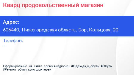 Кварц, продовольственный магазин по адресу 606440, Нижегородская область, Бор, Кольцова, 20 в дальнейшем Организация, размещена в следующих категориях: