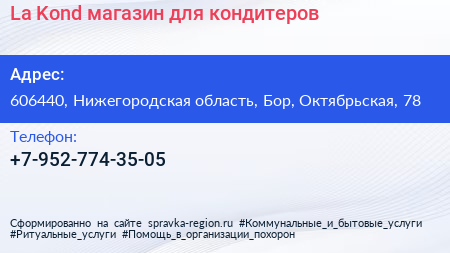 La`Kond, магазин для кондитеров по адресу 606440, Нижегородская область, Бор, Октябрьская, 78 в дальнейшем Организация, размещена в следующих категориях: