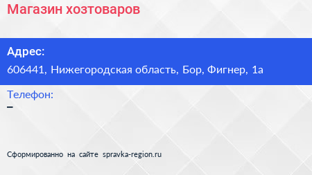 Магазин хозтоваров по адресу 606441, Нижегородская область, Бор, Фигнер, 1а в дальнейшем Организация, размещена в следующих категориях: