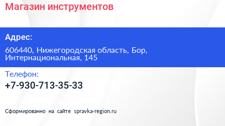 Магазин инструментов по адресу 606440, Нижегородская область, Бор, Интернациональная, 145 в дальнейшем Организация, размещена в следующих категориях: