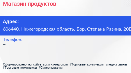Магазин продуктов по адресу 606440, Нижегородская область, Бор, Степана Разина, 20Б в дальнейшем Организация, размещена в следующих категориях: