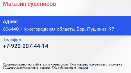 Магазин сувениров по адресу 606440, Нижегородская область, Бор, Пушкина, 97 в дальнейшем Организация, размещена в следующих категориях:
