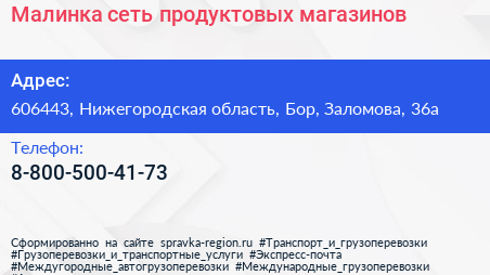 Малинка, сеть продуктовых магазинов по адресу 606443, Нижегородская область, Бор, Заломова, 36а в дальнейшем Организация, размещена в следующих категориях:
