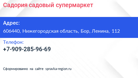Садория, садовый супермаркет по адресу 606440, Нижегородская область, Бор, Ленина, 112 в дальнейшем Организация, размещена в следующих категориях: