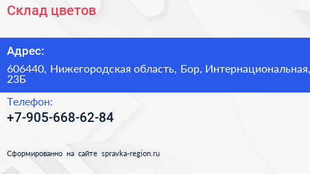 Склад цветов по адресу 606440, Нижегородская область, Бор, Интернациональная, 23Б в дальнейшем Организация, размещена в следующих категориях: